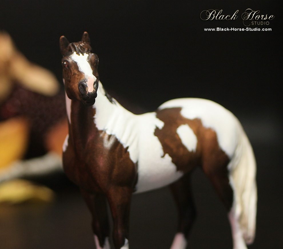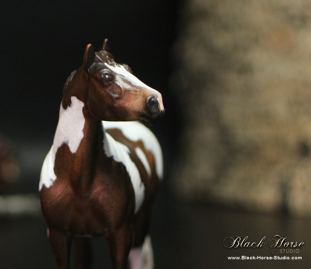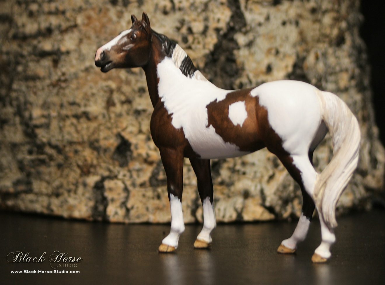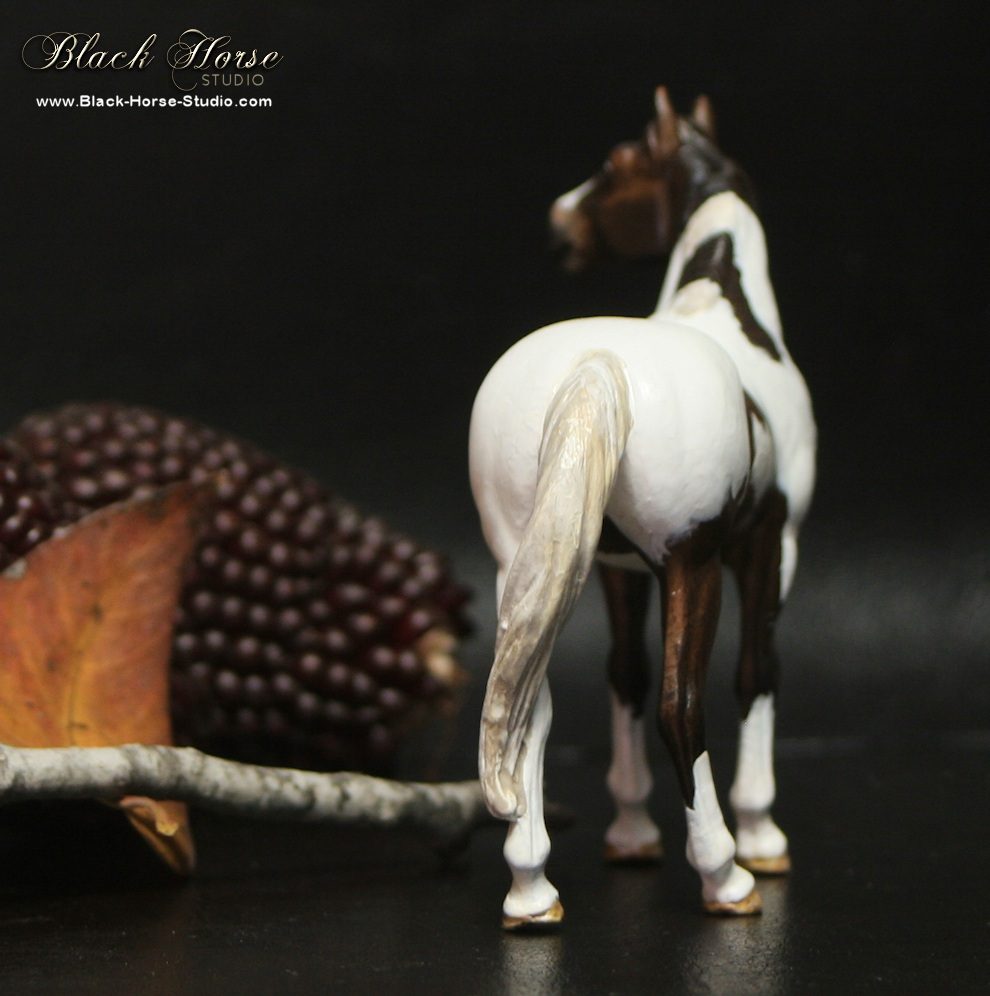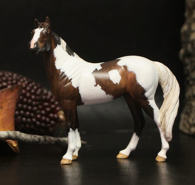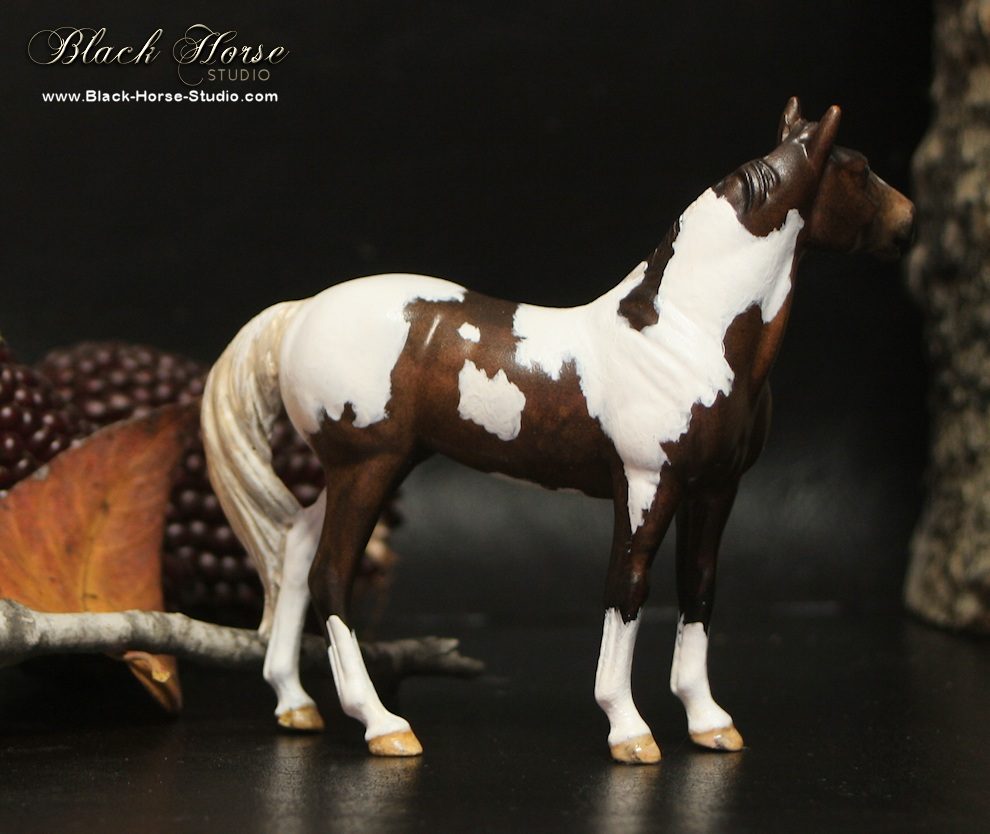 Repainted using Kama Pigments & acrylic paint to a dark dappled bay tobiano. Glossed hooves & eyes. Sprayed with matte clearcoat.