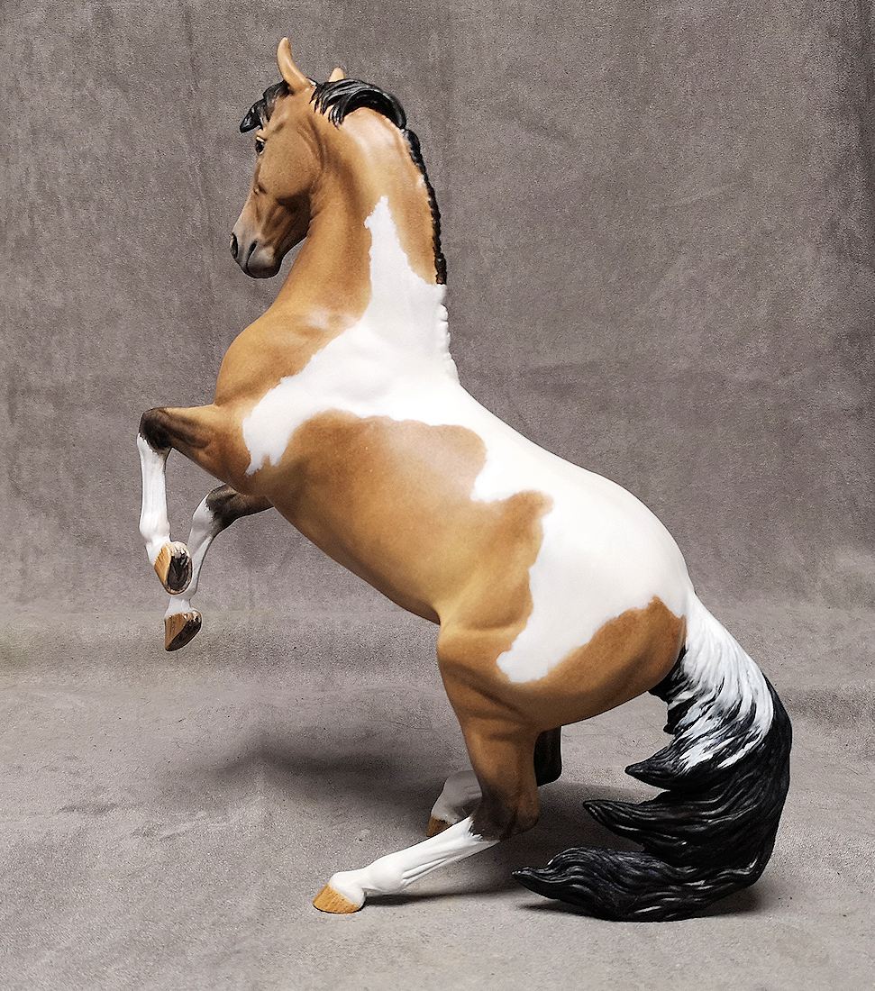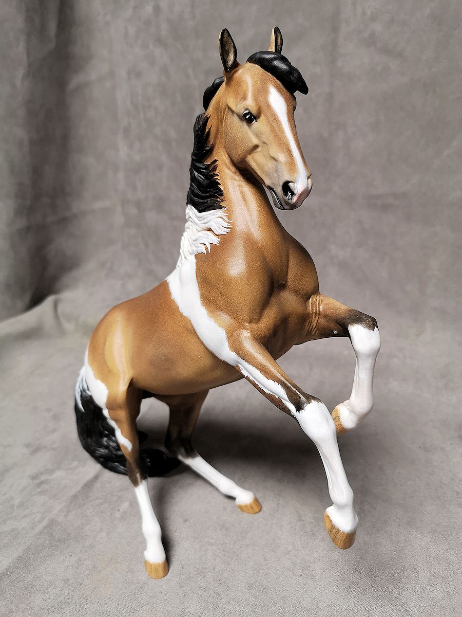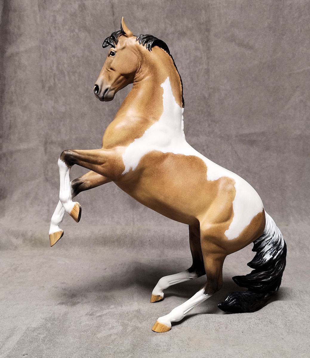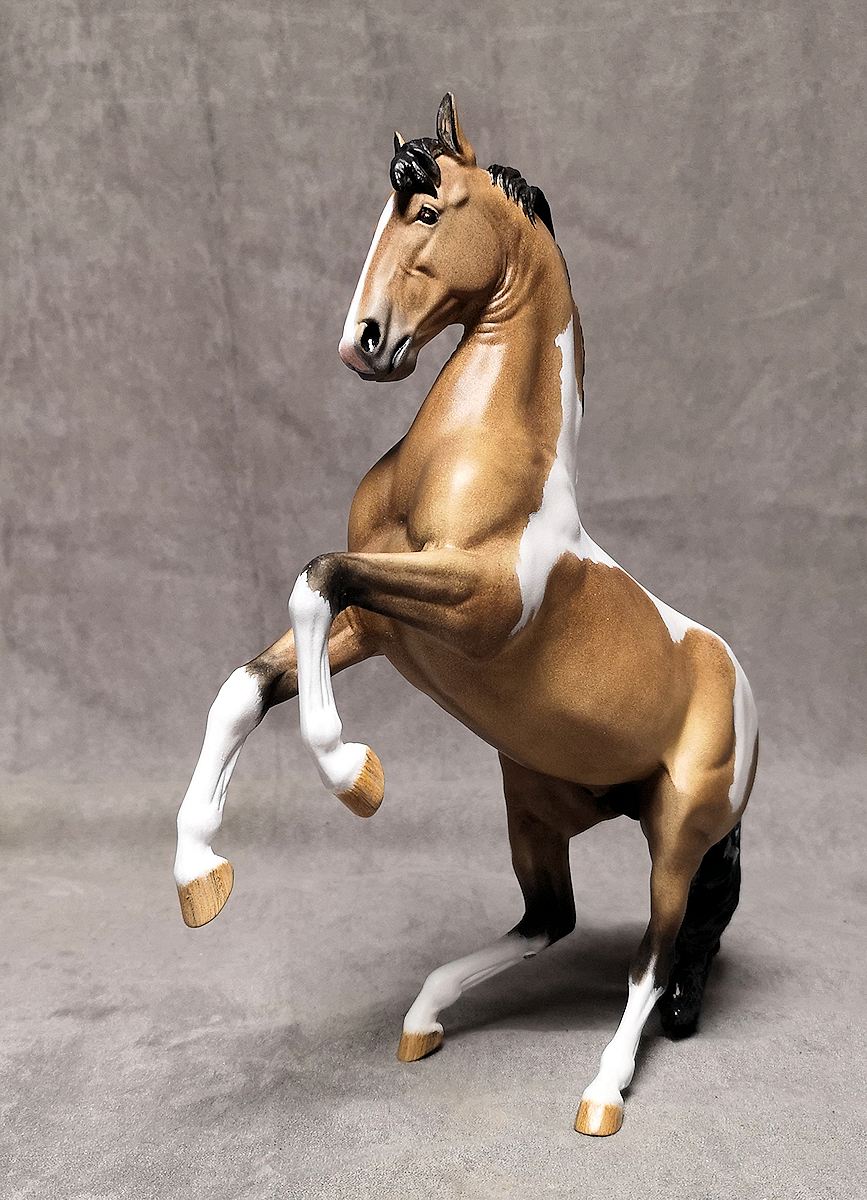 Repainted using Kama Pigments & acrylic paint to a buckskin/dun pinto. Glossed hooves & eyes. Sprayed with matte clearcoat. Sold