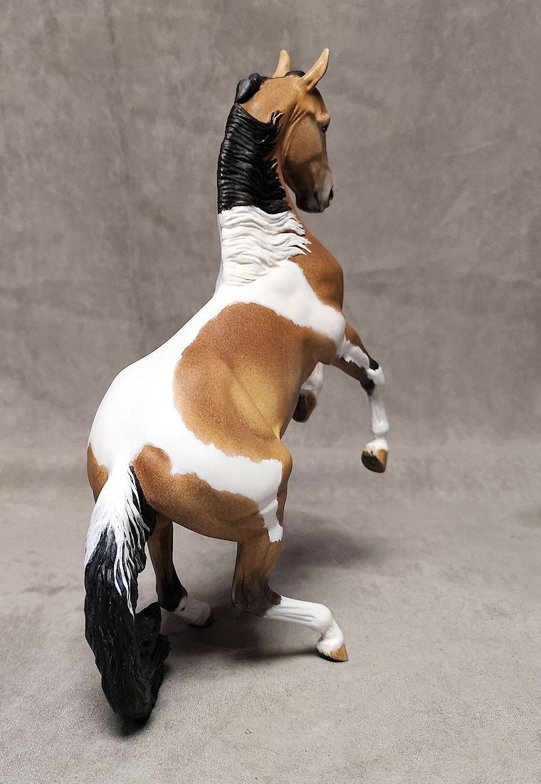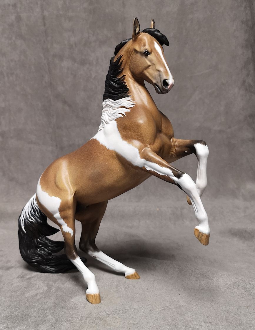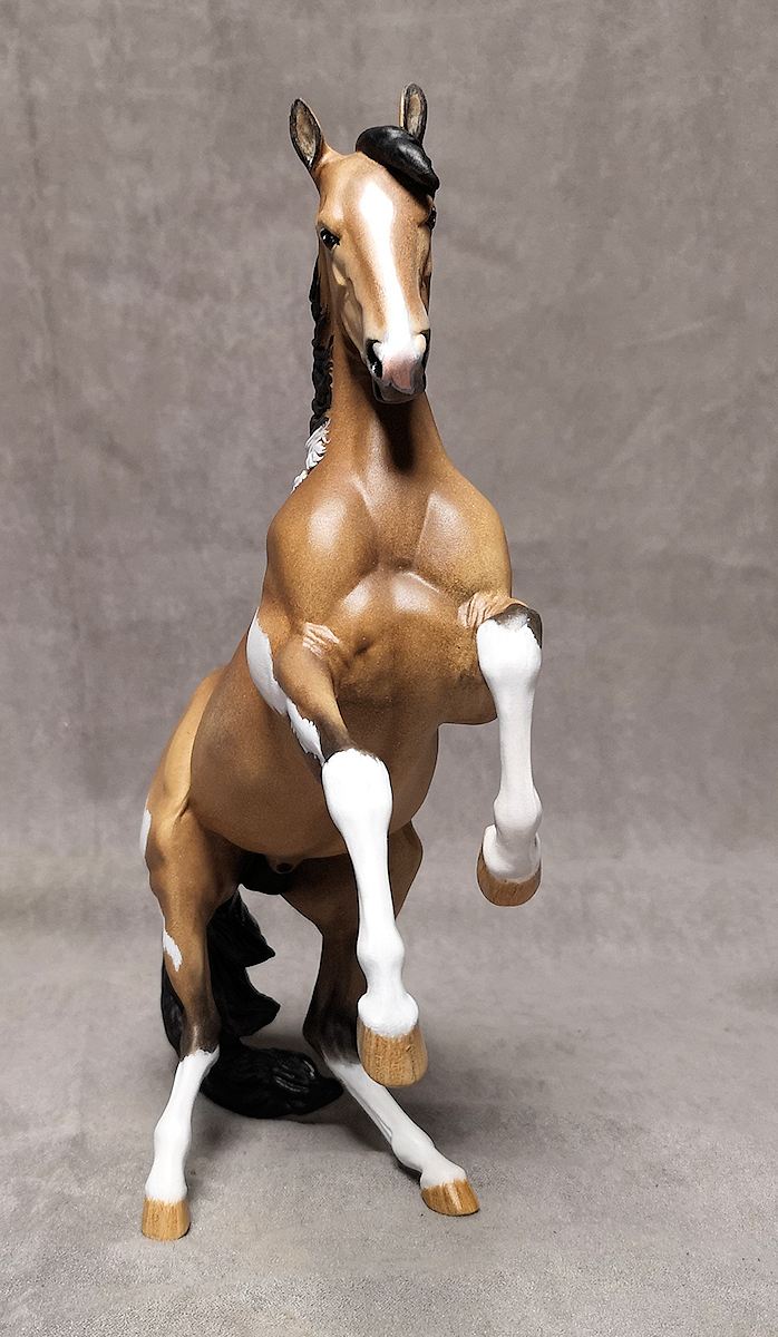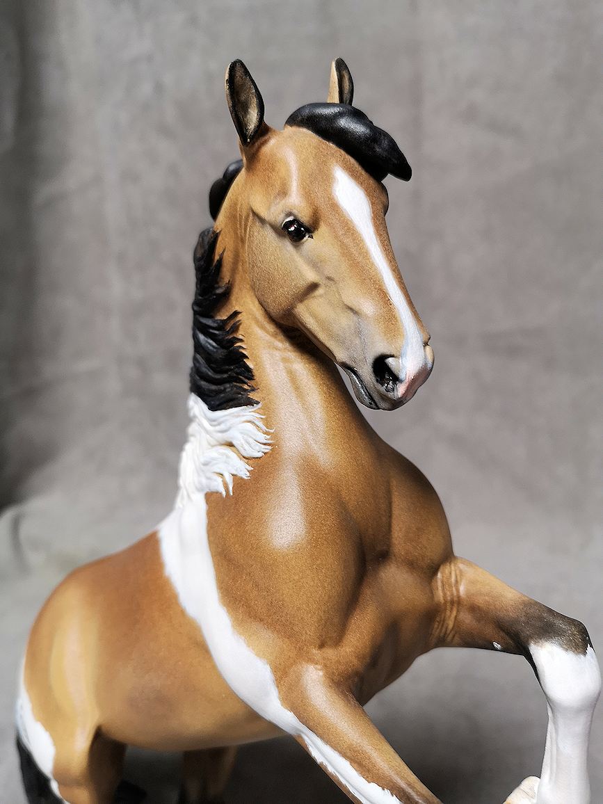 Repainted using Kama Pigments & acrylic paint to a buckskin/dun pinto. Glossed hooves & eyes. Sprayed with matte clearcoat. Sold