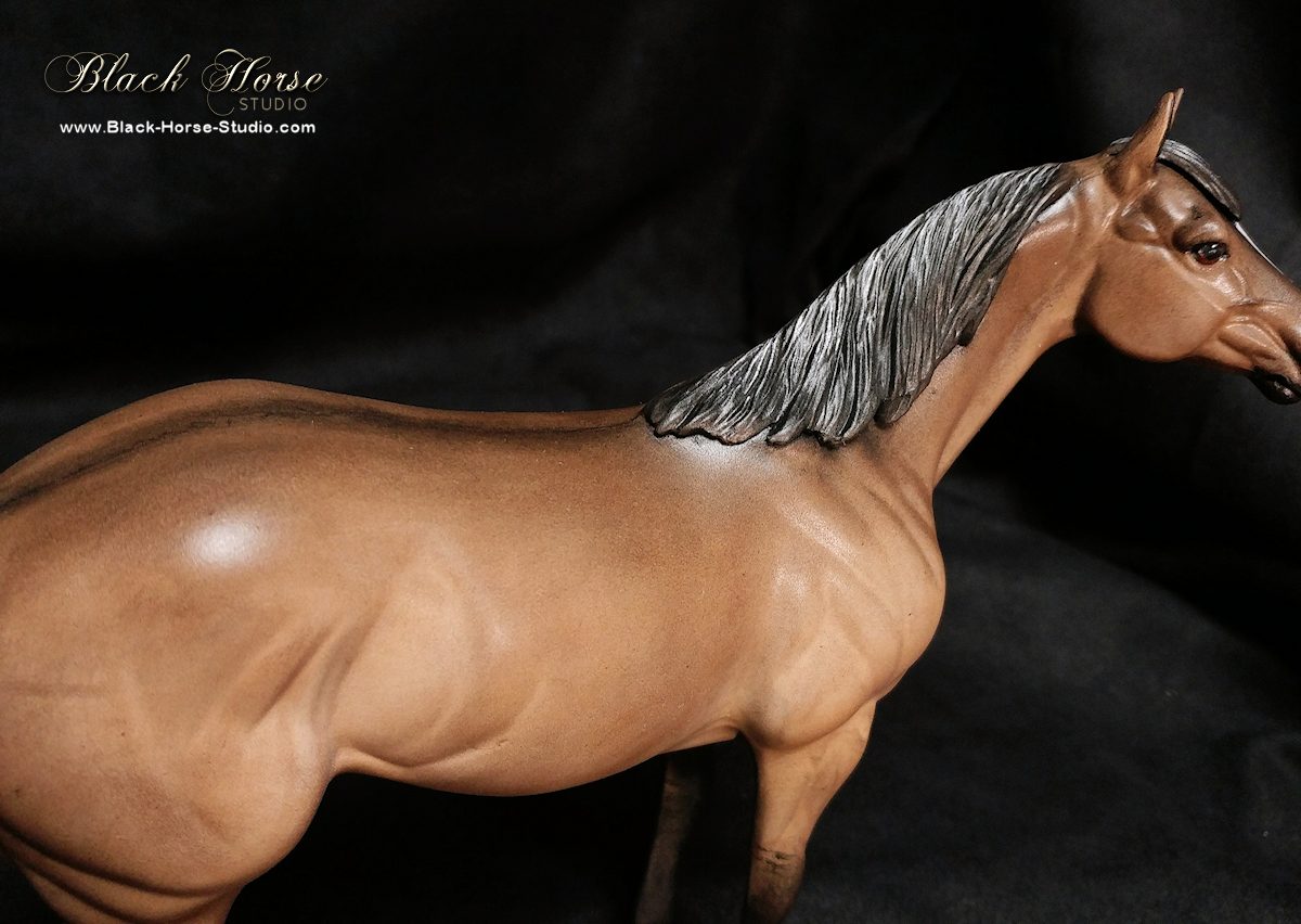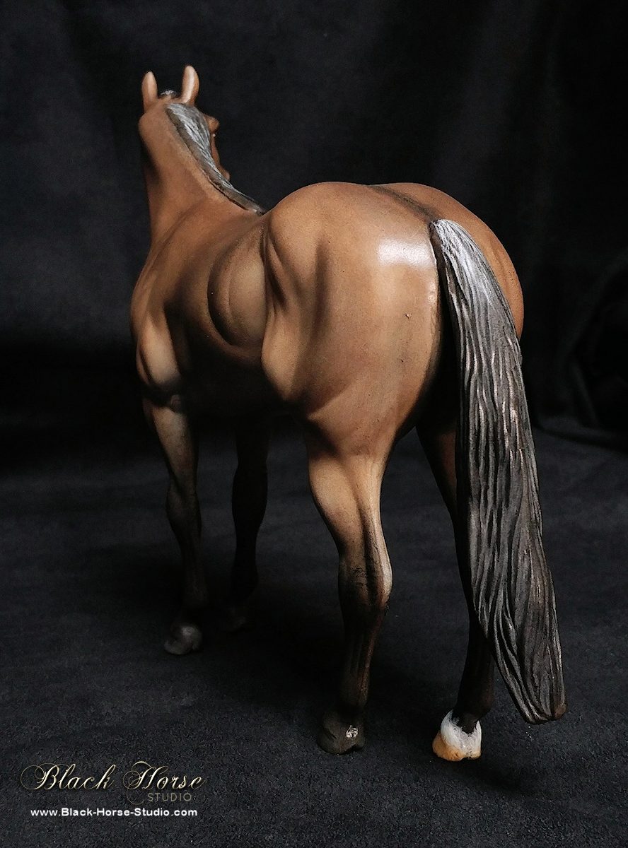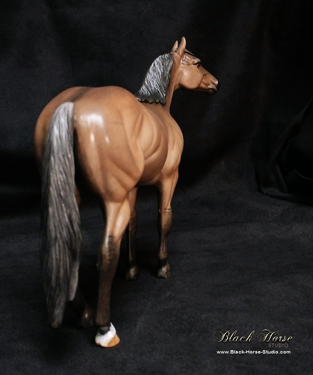 Repainted using Kama Pigments with markings in acrylic to dark grullo/dun. Glossed hooves & eyes. Sprayed with matte clearcoat.