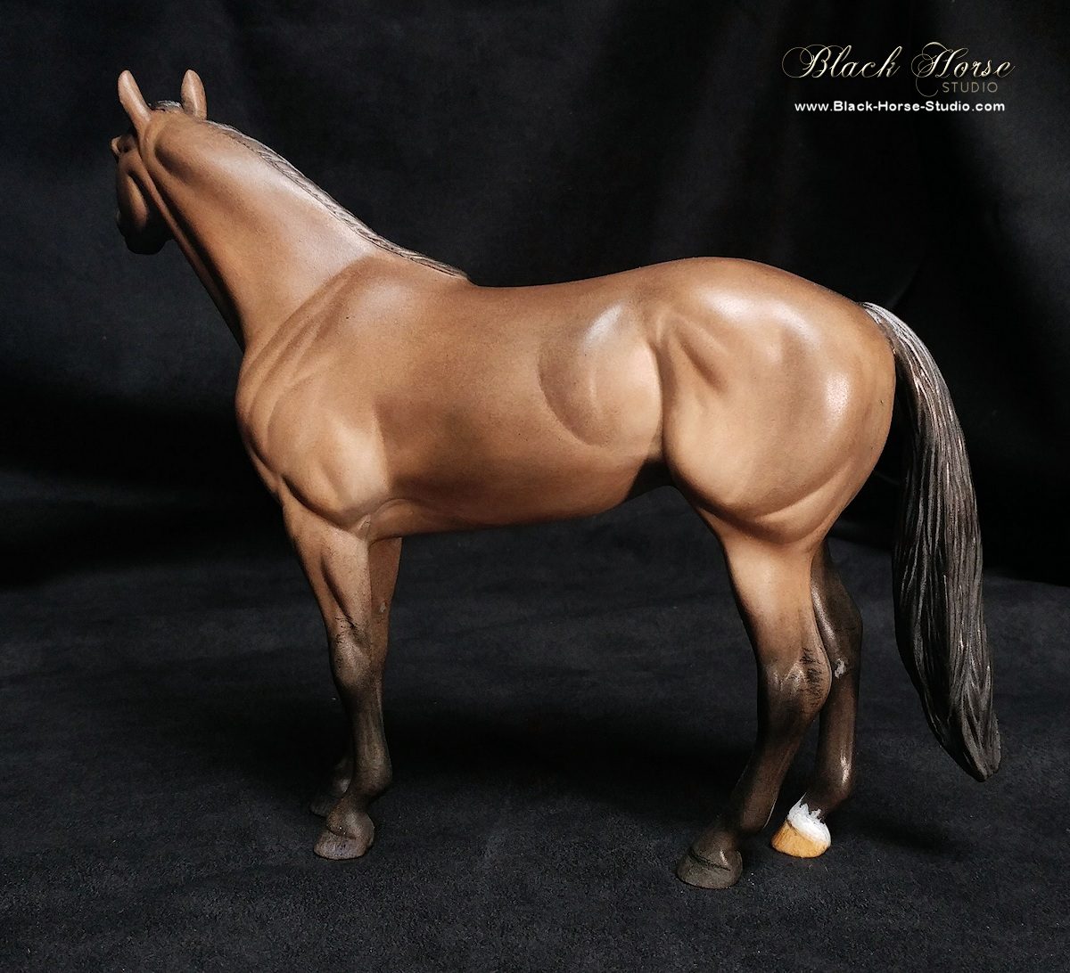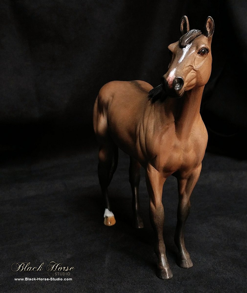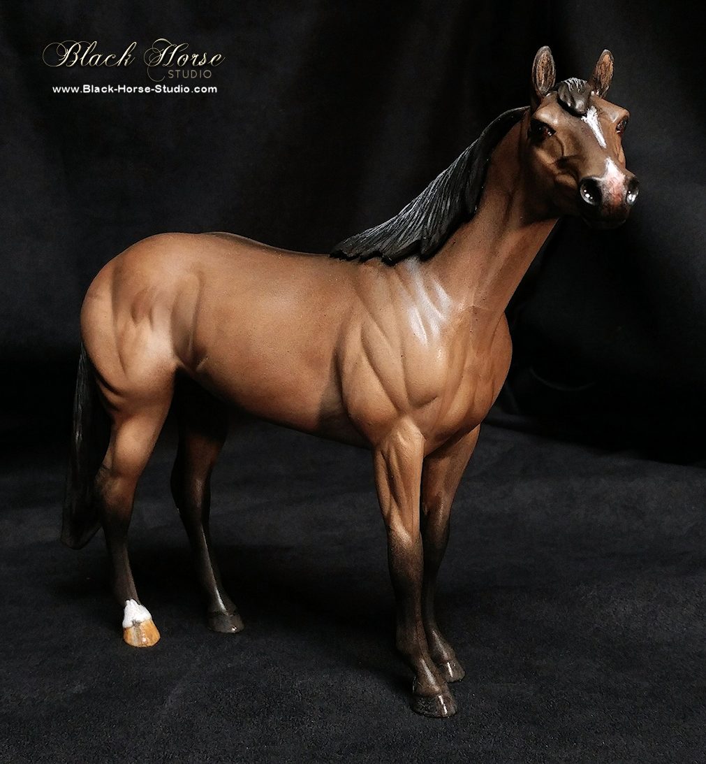 Repainted using Kama Pigments with markings in acrylic to dark grullo/dun. Glossed hooves & eyes. Sprayed with matte clearcoat.