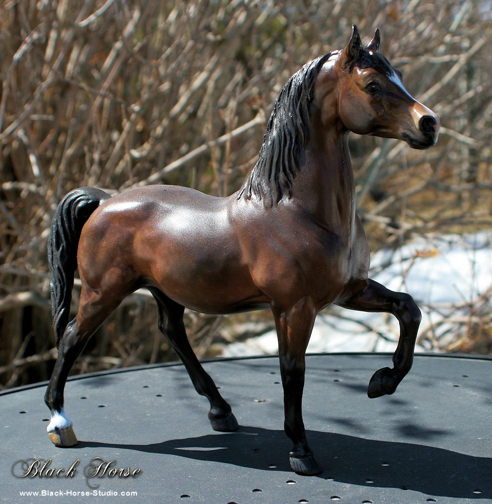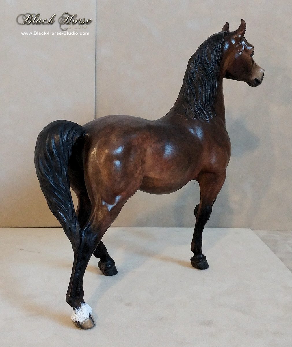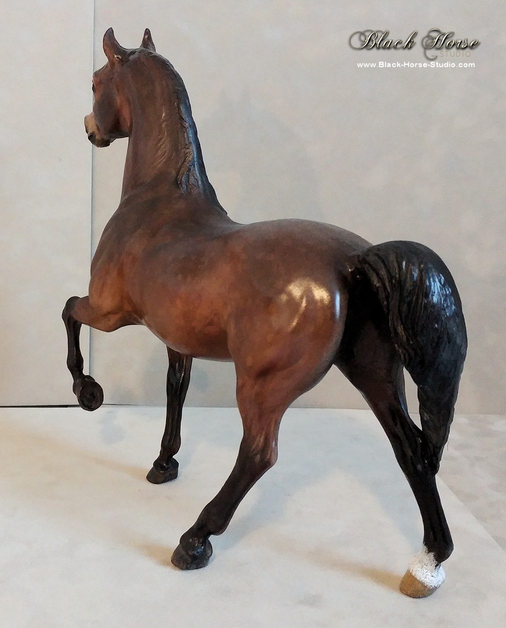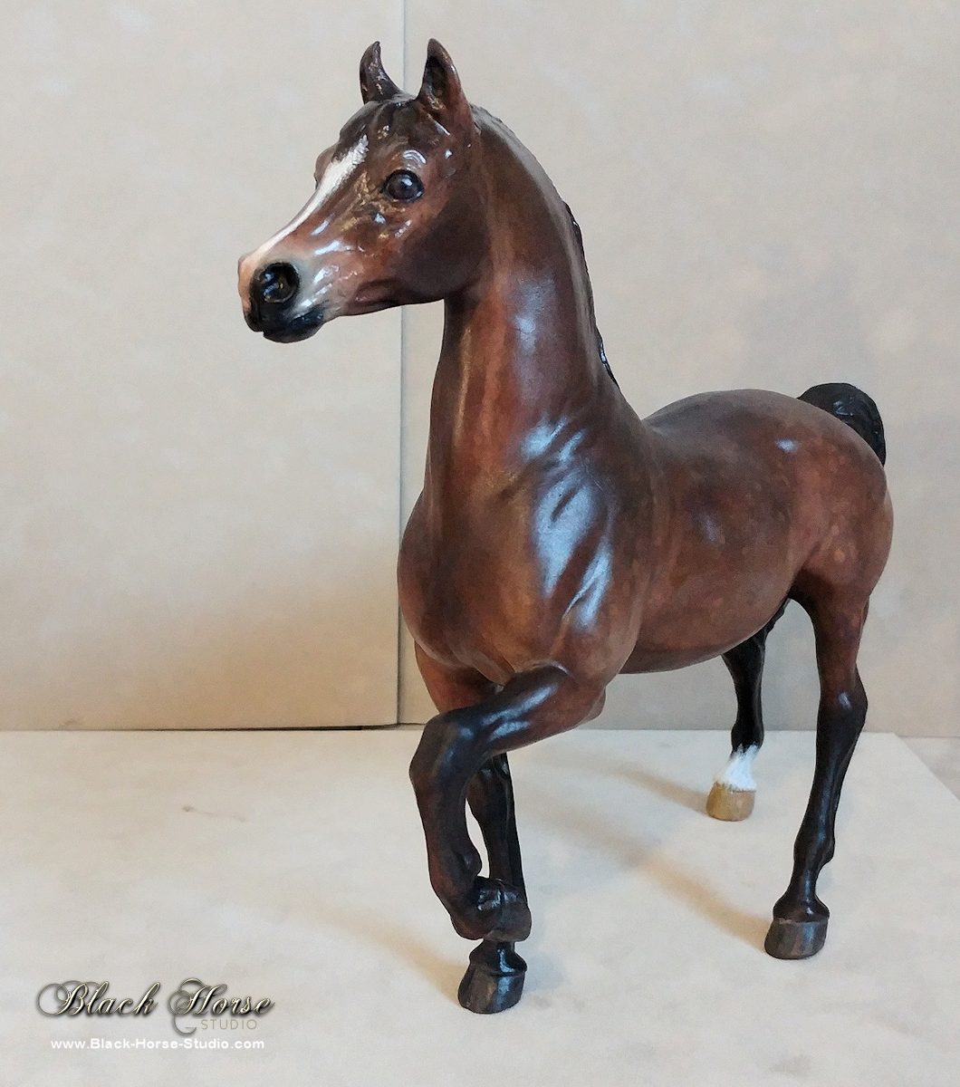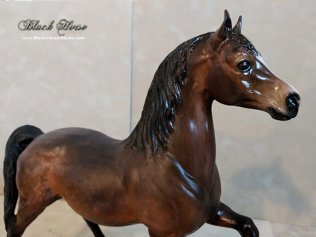 Repainted using Kama Pigments to dark dappled bay with white markings in acrylic. Molded bridle removed. Glossed hooves & eyes. Sprayed with matte clearcoat.