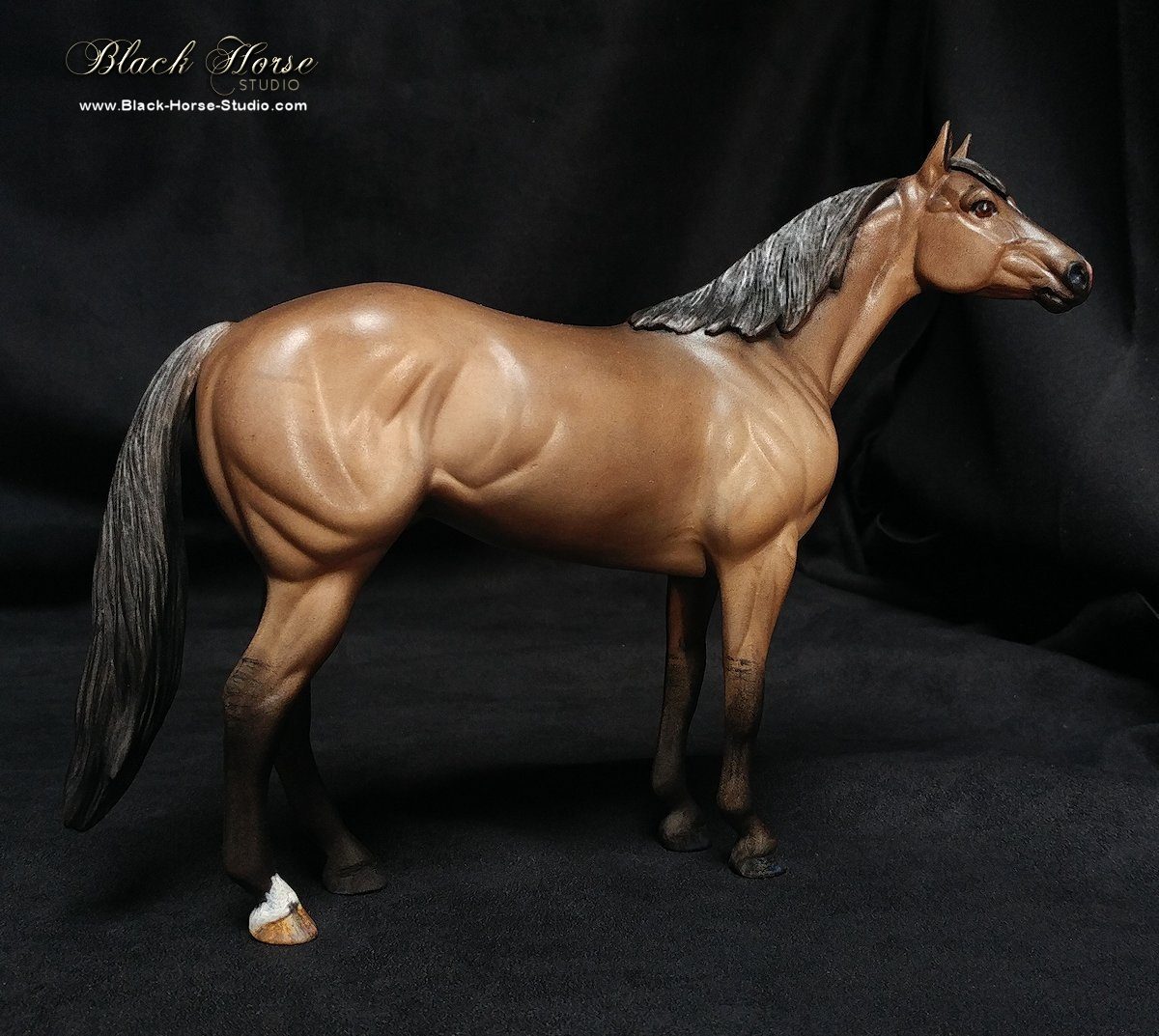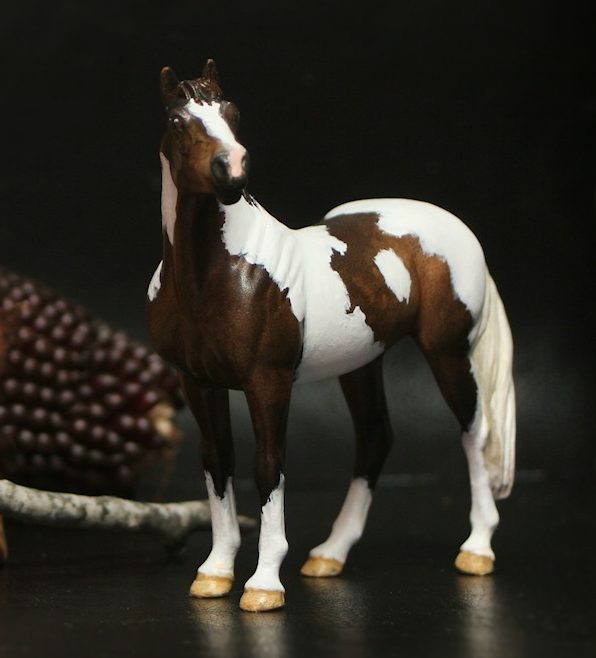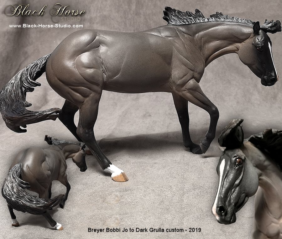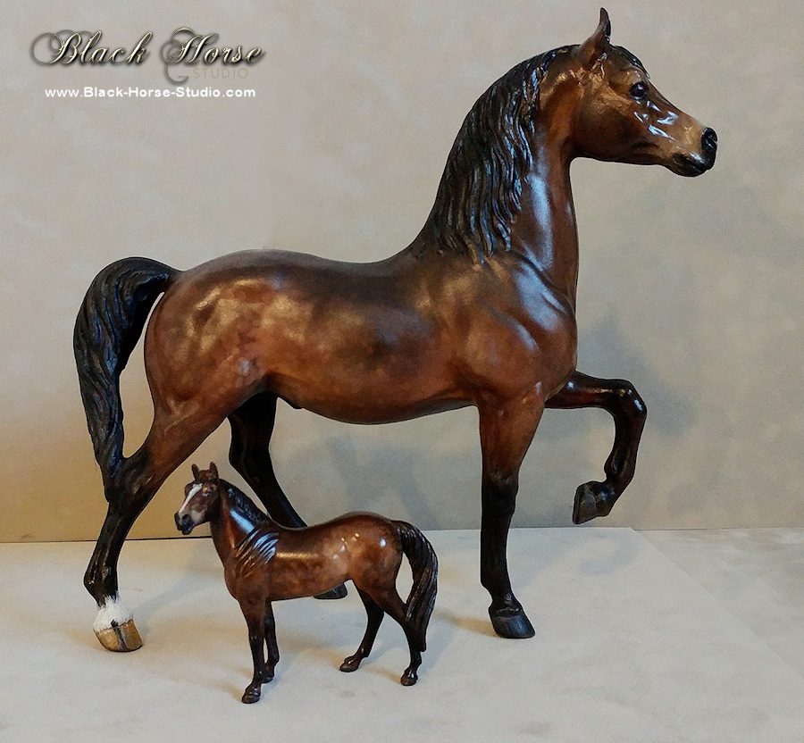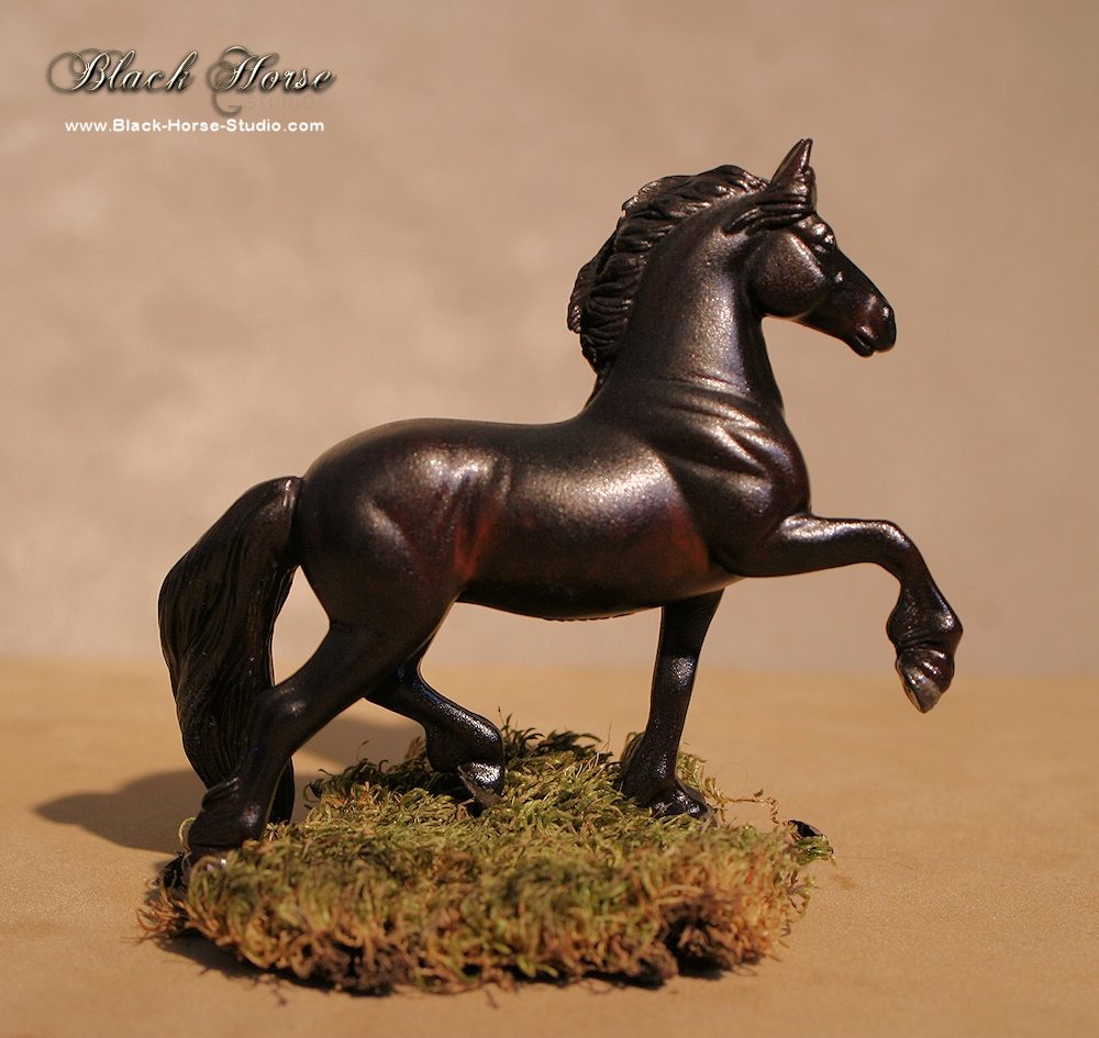 I accept a limited number of requests for repainting of custom models & resins. I generally use Kama Pigments & acrylic paint. Glossed hooves & eyes. I spray the finished work with a matte clearcoat to protect it.  You can see samples of my work below. Prepwork is extra if required.  I am also a flatwork painter and you can see my artwork at BlackHorseDesign.com.  To inquire about booking your custom painted model, contact me at info@black-horse-studio.com for a price quote.